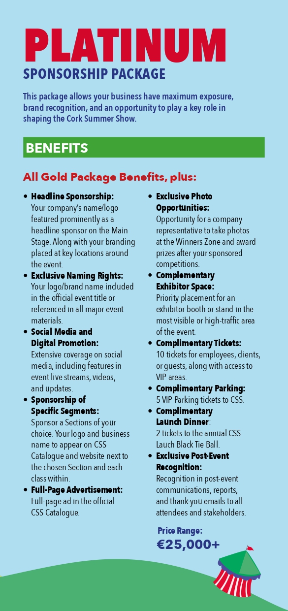 Take your support of the Cork Summer Show to the highest level with our Platinum Sponsorship Package — the ultimate way to showcase your brand, gain unmatched exposure, and make a lasting impact on Ireland’s premier agricultural event.
